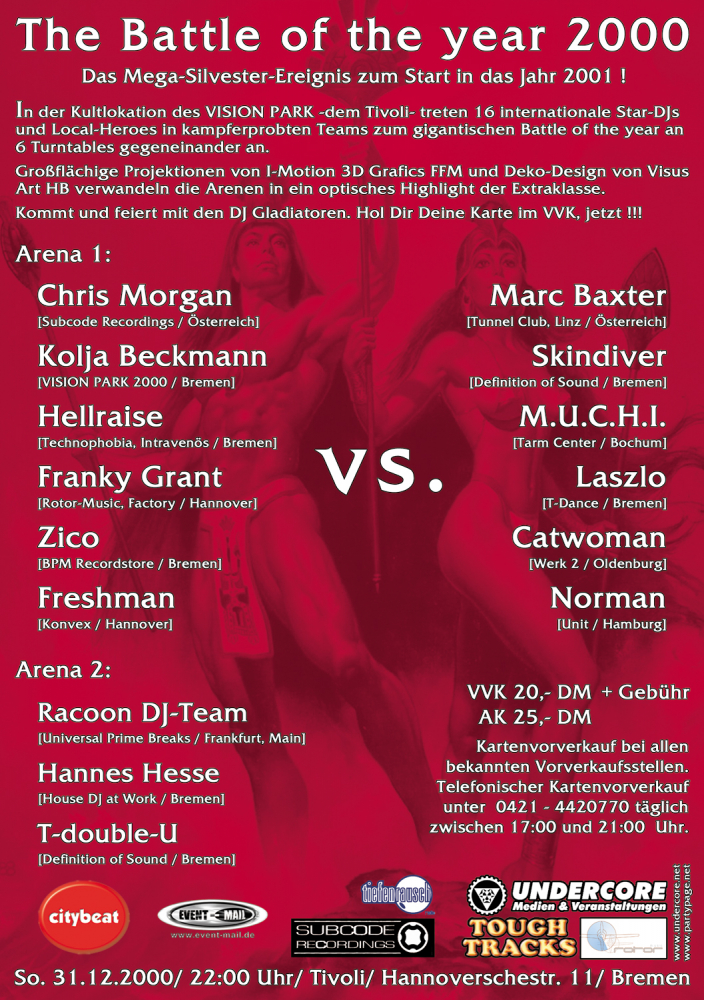 Das Mega-Ereignis zum Start in das Jahr 2001 ! In der Kultlokation des VISION PARK -dem Tivoli- treten internationale Star-DJs & Local-Heroes in kampferprobten Teams zum gigantischen Battle of the year an 6 Turntables gegeneinander an.