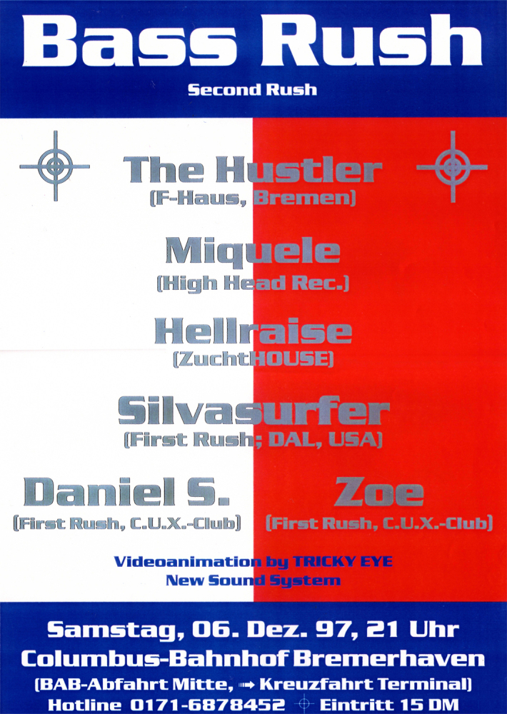The Hustler (F-Haus, Bremen), Miquele (High Head Rec.), Hellraise (ZuchtHOUSE), Silvasurfer (First Rush; DAL, USA), Daniel S. (First Rush, C.U.X.-Club), Zoe (First Rush, C.U.X.-Club)